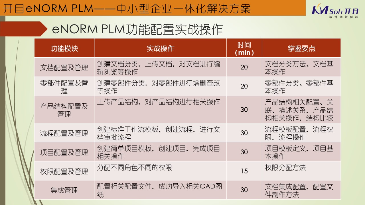 PDM/PLM概念产生于上世纪末,逐渐被广大的制造企业普遍认可,已经成为制造企业尤其是离散型制造企业的信息化的实施重点。本课程将全面系统的阐述PDM/PLM的基本理念、主要功能,对开目eNORM-PLM这套软件展开实际安装和操作,研讨过程中穿插大量的讨论,充分进行互相交流。该培训班开过2届,内容丰富,讲解过程生动,得到学员的一致好评!